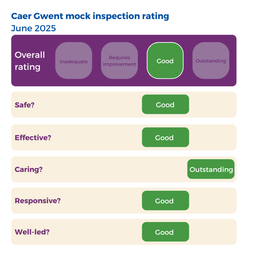 Caer Gwent has been rated good in our 6 monthly internal mock CQC inspection by our designated Safety and Compliance Team and audited monthly as part of our commitment to continuous quality improvement.