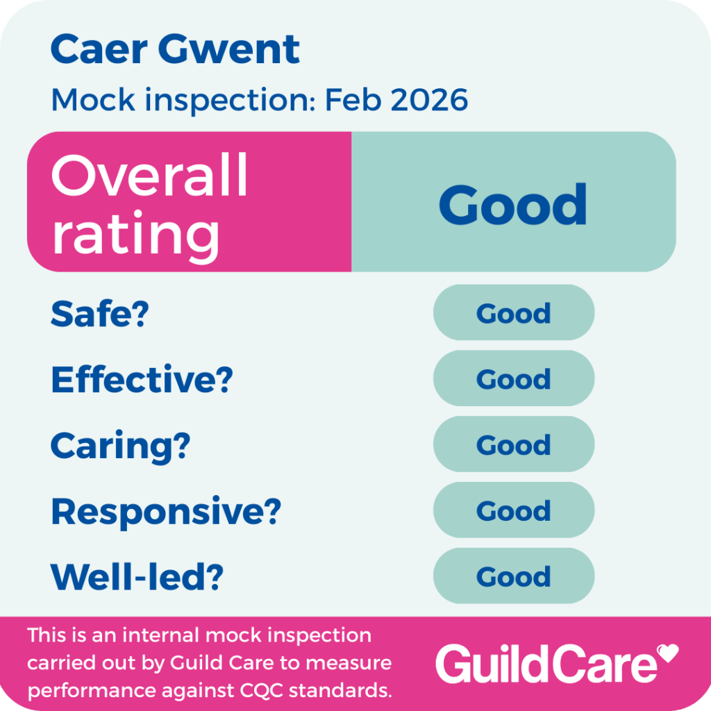 Caer Gwent has been rated good in our six-monthly internal mock CQC inspection by our designated Safety and Compliance Team and audited monthly as part of our commitment to continuous quality improvement. This is an internal mock inspection carried out by Guild Care to measure performance against CQC standards.